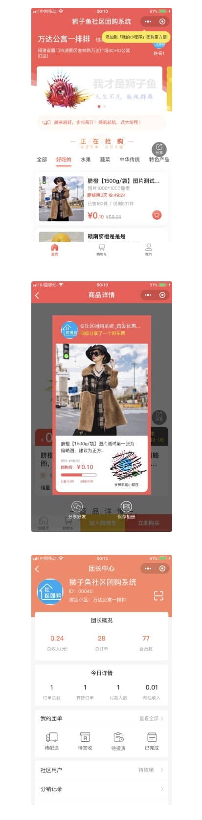 狮子鱼社区团购小程序,社区团购,社区拼团,社区电商,人人店,人人代言,独创双模式:以团长为中心,以小区为中心,首款支持社区团购+社群团购模式的团购小程序,线上线下双模式,后台自由配置配送方式。S2B2C模式,无缝连接人、货、场。